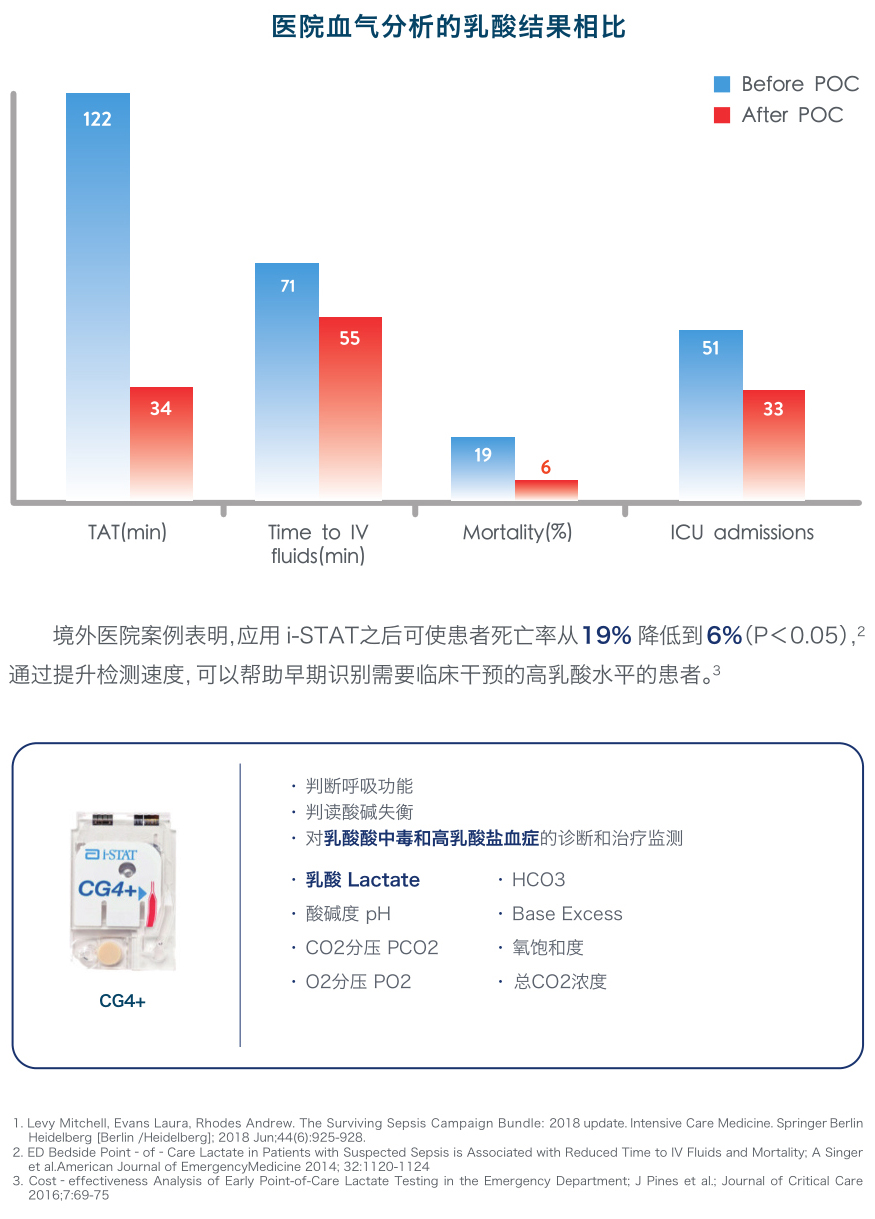 i-STAT的CG4+卡片可快速筛查疑似脓毒血症患者,使患者尽早进行液体复苏治疗。