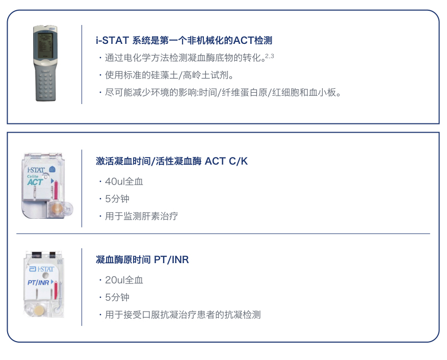 i-STAT Celite ACT Cartridge 激活凝血时间测试卡片(干式电化学法)是一项体外诊断检测,使用新鲜全血进行,由于肝素经常用于临床及外科操作中,ACT 主要用于监控患者因肝素而产生的抗凝状态。其通常被用于心导管植入术、经皮穿刺冠状动脉成形术(PTCA)、肾透析、血液透析及旁路过程中的体外循环。