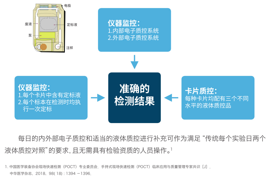 每张卡片自带单点定标,机器同时配有内部/外部电子质控和液体质控系统,无需专人维护。提供实验室品质的检测结果。